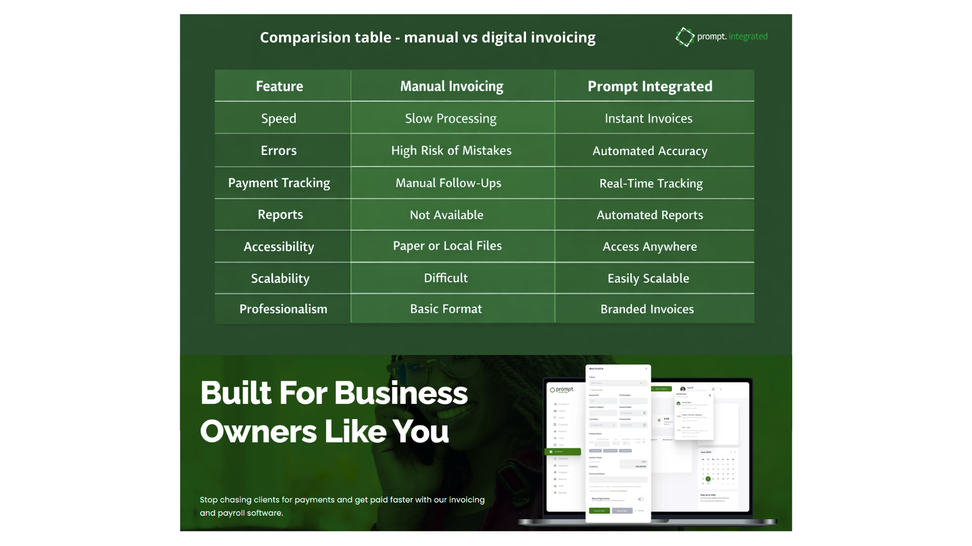 Prompt Integrated tackles these challenges by substituting handwritten invoices with structured, user-friendly digital systems tailored for actual business environments. Rather than requiring businesses to adjust to complicated software, the platform streamlines daily tasks such as generating invoices instantly, securely storing records, automatically tracking payments, and monitoring financial performance in real time. The outcome is not just convenience; it brings operational clarity as well.