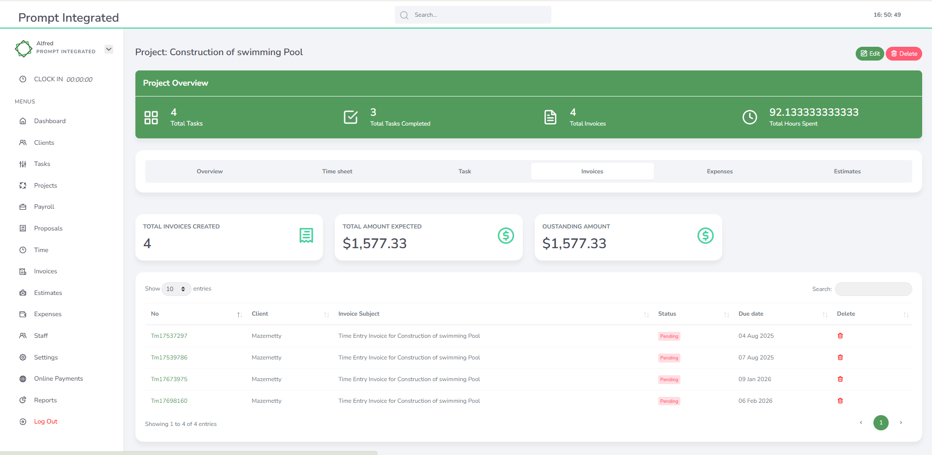 Because Prompt Integrated connects project management directly to invoicing and payments, the process of raising a project invoice becomes straightforward. The expense records, timesheets, and billing rates that were captured throughout the project feed directly into the invoice — reducing the manual work of compiling costs after the fact and minimising the risk of under-billing or omitting expenses.