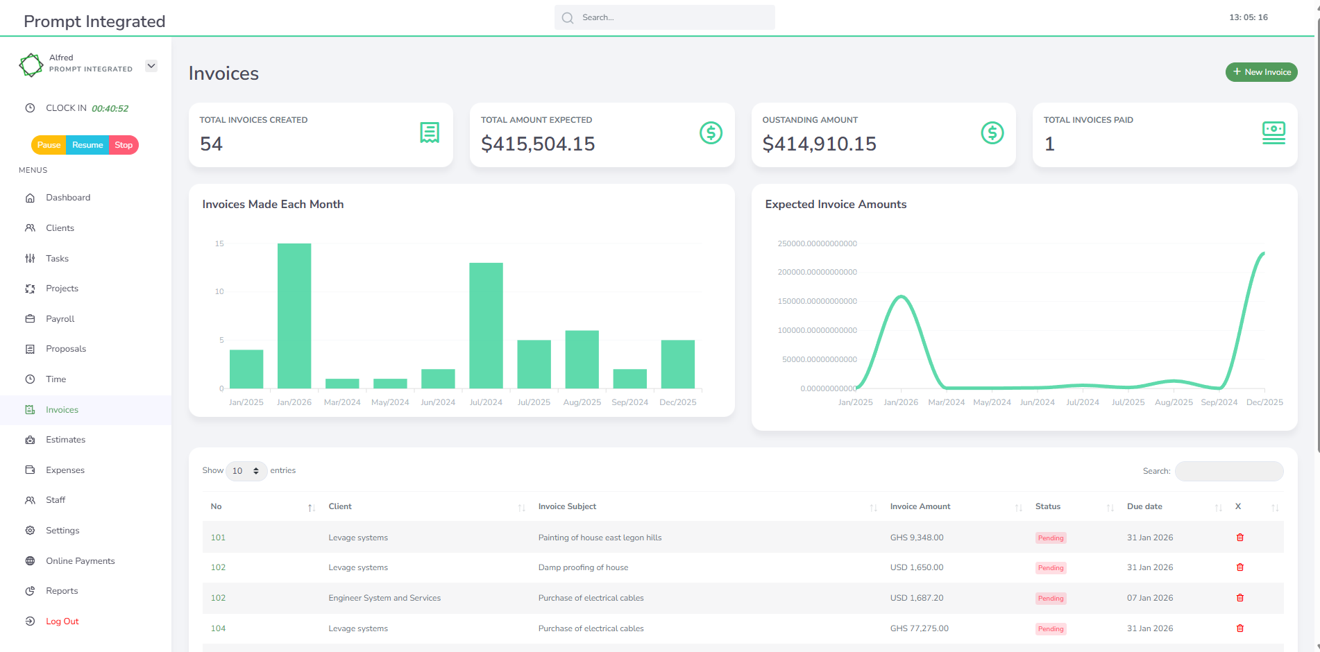 Instead of juggling multiple systems, Prompt integrated brings invoicing, project management, expense tracking, time tracking, proposals, payroll, and payments into one cloud-based platform. Everything is connected, which means data flows naturally from one function to another.