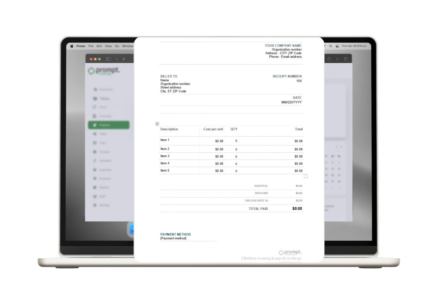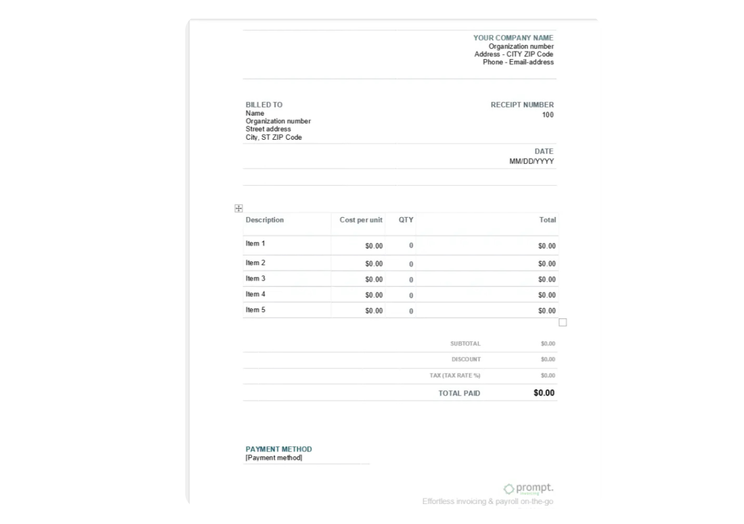 Create professional receipts with our free receipt template. Download now and simplify the process of sending receipts to clients after they’ve paid you.